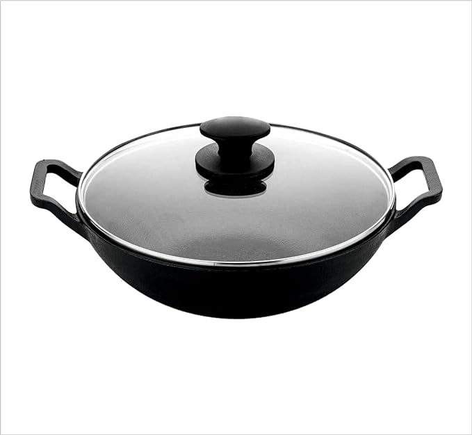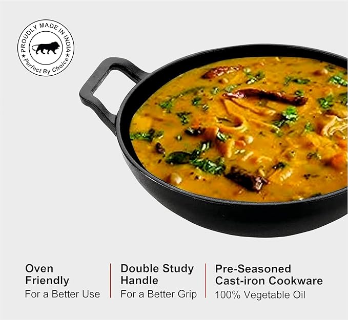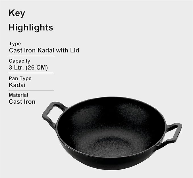Preet Cookware Cast Iron Kadhai, Kadai for Cooking Deep Fry, Oven Safe Cookware Induction Friendly Loha Kadhai – 3 Litre (26cm), Black with Lid